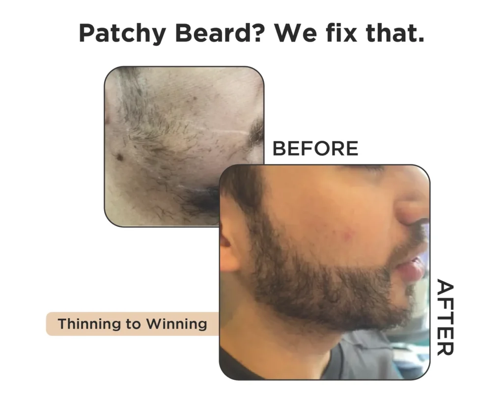 A beard restoration involves taking healthy hair follicles from a part of the scalp where hair is genetically programmed to keep growing for life and transplanting them to the patchy areas of the beard affected by hair loss. These newly implanted hairs will last a lifetime and are therefore permanent.
